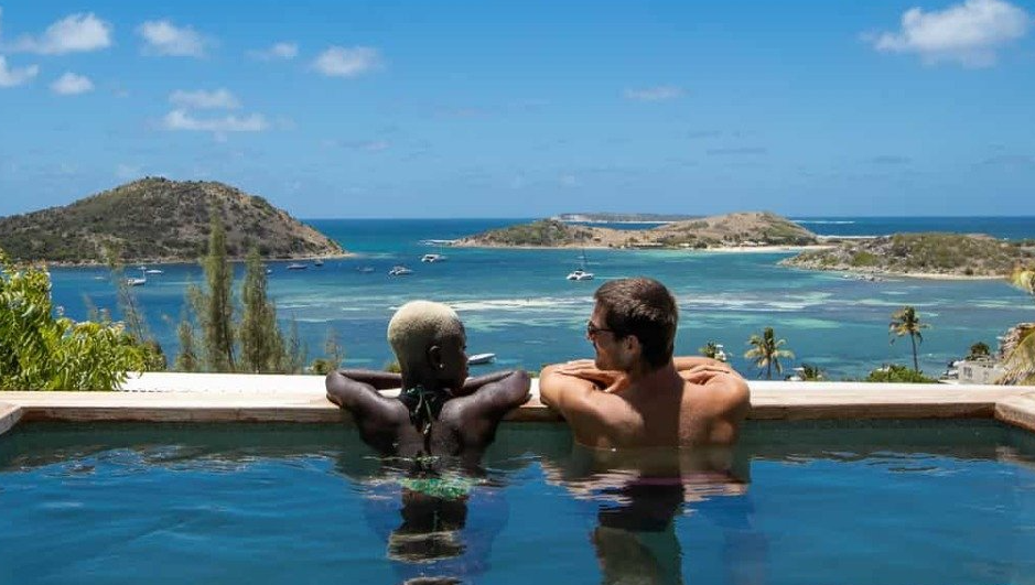Trois suites avec jacuzzi privatifs (non chauffés) et vue panoramique sur la baie et l'ilet Pinel.